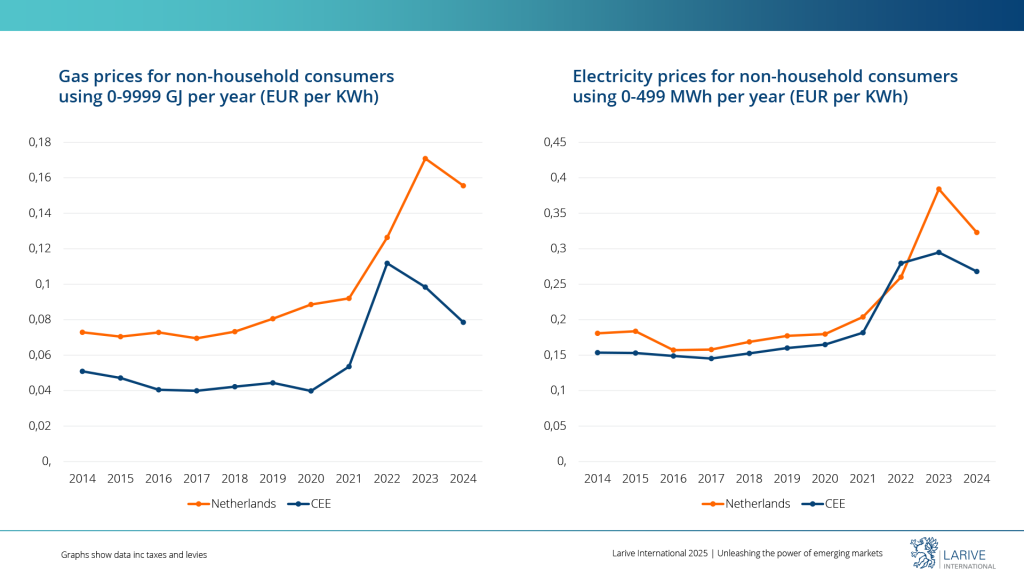 Dutch SMEs with energy-intensive production processes for (petro)chemicals, metals, paper, building materials, agricultural processing, and greenhouse horticulture are particularly vulnerable to the significant rise in energy costs. This impacts their competitiveness significantly in both an European and a global context. Fluctuating energy costs force SMEs to face difficult trade-offs, such as reducing or delaying investments, or cutting labour costs (through layoffs or halting new hires). As energy prices in Western Europe continue to rise, energy costs in Eastern Europe remain more stable, offering a strategic advantage for Dutch businesses seeking cost-effective alternatives. Eastern European energy costs can remain stable due to a more diversified energy mix, lower energy taxes, and stronger energy supply independence.
