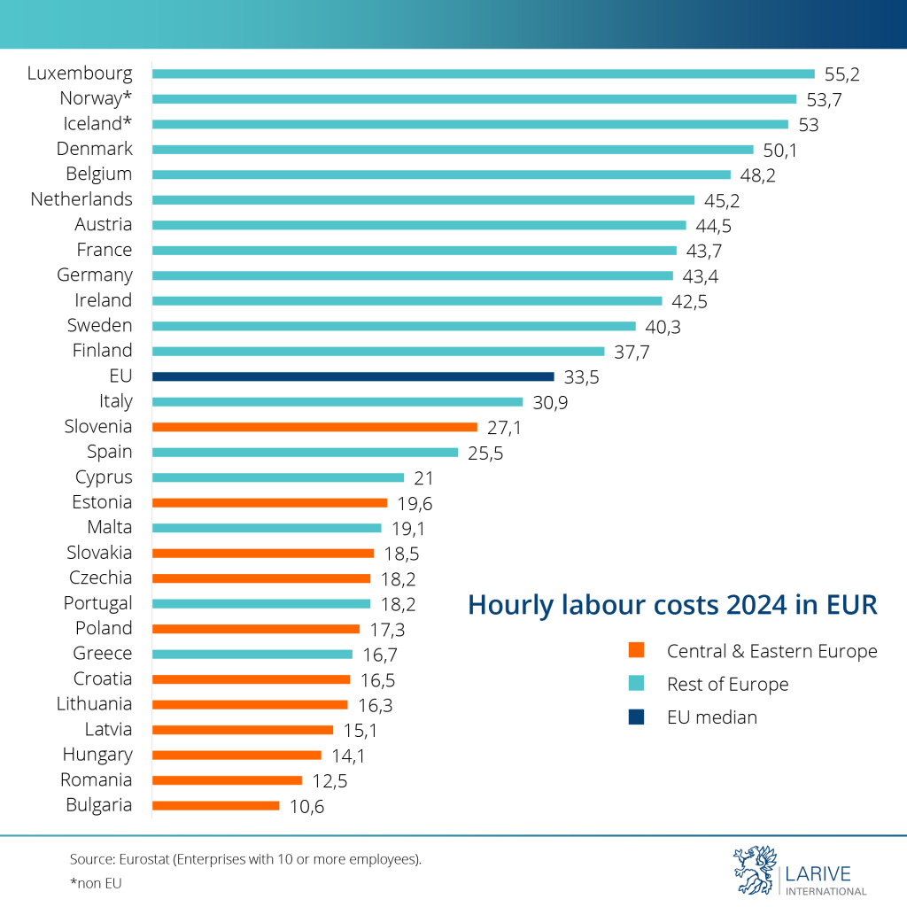 Throughout Europe, labour costs are rising due to inflation, the cost of living, and tightening labour markets for skilled workers. However, significant differences in labour costs persist across the EU. With an average labour cost in the EU of €33.5 and a maximum-to-minimum ratio of more than five times, the level of disparity is significant.