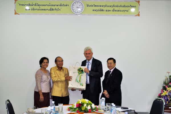 Mrs. Suda-Art Khantivong (Deputy MD Viengthong Pharma), Mr. Thongpheuane Khantivong (Managing Director of Viengthong Pharma), Mr. Joan Boer (Ambassador of the Kingdom of the Netherlands in Thailand) and Mr. Chernporn Tengamnuay (Managing Director of Greater Pharma) at the head office of Viengthong Pharma, Vientiane, Laos.