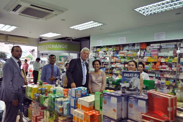 Mrs. Suda-Art Khantivong (Deputy MD Viengthong Pharma) and Mr. Joan Boer (Ambassador of the Kingdom of the Netherlands in Thailand) at Saysaath Pharmacy, Vientiane, Laos.