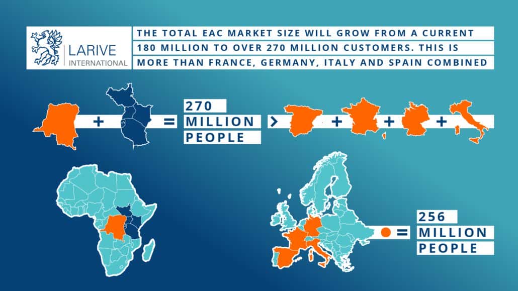 With the DRC having a total population of around 90 million inhabitants, the total EAC market size will grow from a current 180 million to over 270 million customers. This is more than France, Germany, Italy and Spain combined.