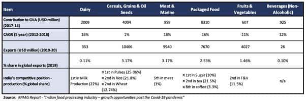 - The food processing industry was among the least impacted sectors due to Covid-19 (except the meat and marine food segment, which witnessed a negative impact due to low demand – mainly due to initial misinformation campaigns, especially around poultry meat consumption).