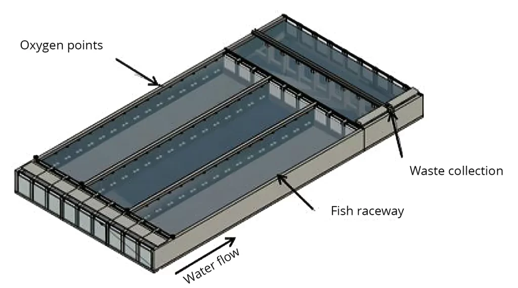 These raceways are defined water channels, for example 30 metres long, 5 metres wide and 2.5 metres deep; however, the size depends on the stocking density, fish species and purpose. Fish are stocked in these channels where continuous water circulation delivers oxygen and removes waste. The raceways occupy just 2–3% of the total pond surface, while the remaining 97–98% functions as a natural biological treatment zone, recirculating and purifying the water without chemical inputs. Waste collected at a central outlet can be repurposed as organic fertiliser, thus reusing the nutrients and reducing environmental impact.