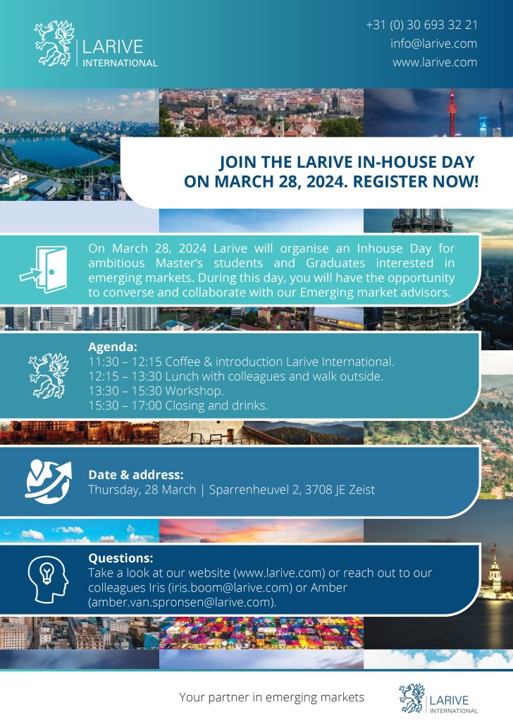 On March 28, 2024, Larive International will organise an In-house Day for ambitious Master’s students and graduates with an interest in emerging market advisory.
