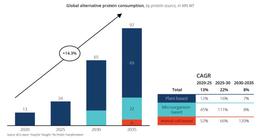 By 2035, the share of alternatives in the meat, dairy, egg and seafood market is estimated between 10 and 22%, depending on technological advancements and the supportiveness of consumers. Consumption is expected to increase to more than seven times, leading to 97 million MT in 2035, to an estimated market of USD 290 billion. The European, American, and Chinese market are considered the largest markets.