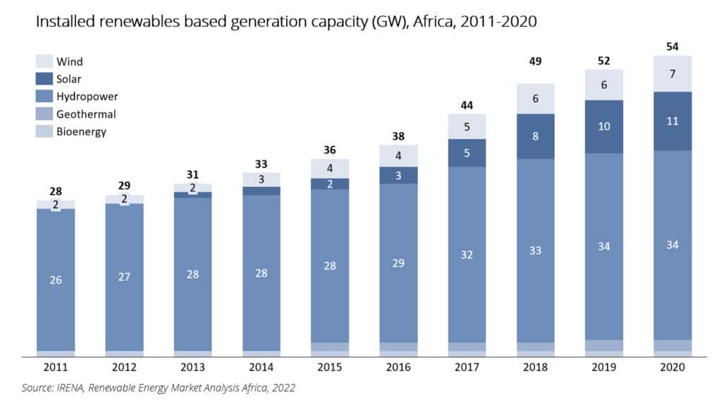 Over the last decade, solar energy is the fastest-growing renewable energy source in Africa. Between 2011 and 2020, solar capacity in Africa grew at an average compound annual growth rate (CAGR) of 54%. Total solar additions over that period amounted to 10.4 GW. This growth is largely driven by utility-scale solar projects in Southern Africa, with South Africa accounting for most solar production on the continent.