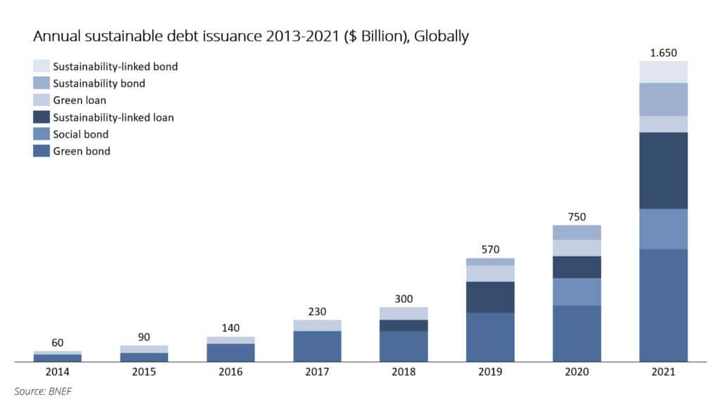 In addition, there is sufficient capital in the world searching for net-zero investments. Investors are taking two strategies to reach net zero, either reducing or substituting the emissions. Both are often financed through sustainability-linked finance instruments which have a compound annual growth rate (CAGR) of 61% over the last 8 years. The volumes of sustainable debt issuance on an annual basis still make up a relatively small portion of the total debt market, but the $1.6 trillion in issuance in 2021 is significant to say the least.