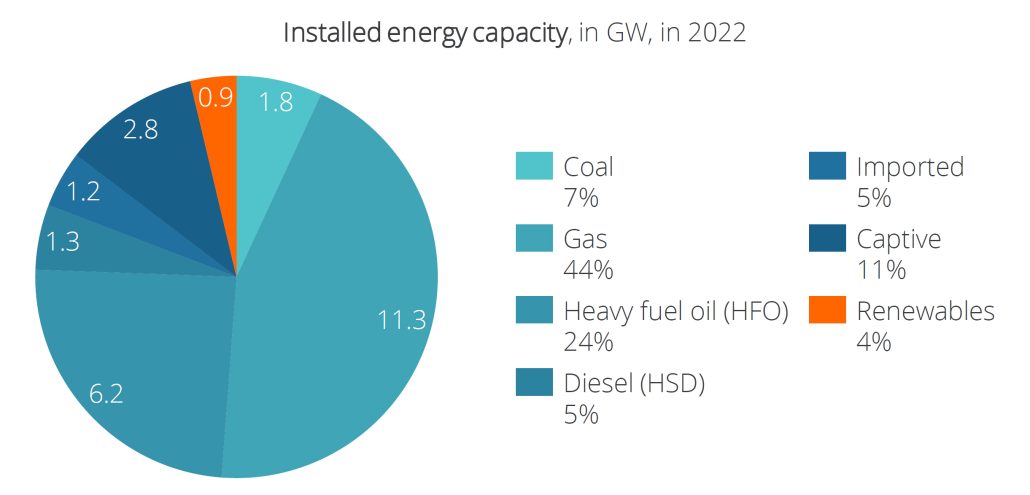 Natural gas has remained the primary and cheapest source of energy over the last decade. However, a reduction in the number of explorations and growing demand has depleted gas reserves. This has increased dependency on imported LNG and Heavy Fuel Oil (HFO). The current fuel mix of Bangladesh’s power plants heavily depends on natural gas, oil, coal, and diesel (jointly >80%), of which the government plans to reduce dependence on domestic natural gas. This is done by increasing the use of imported liquified natural gas (LNG), importing more electricity from neighbouring countries, and expanding the use of renewable resources, especially solar power.