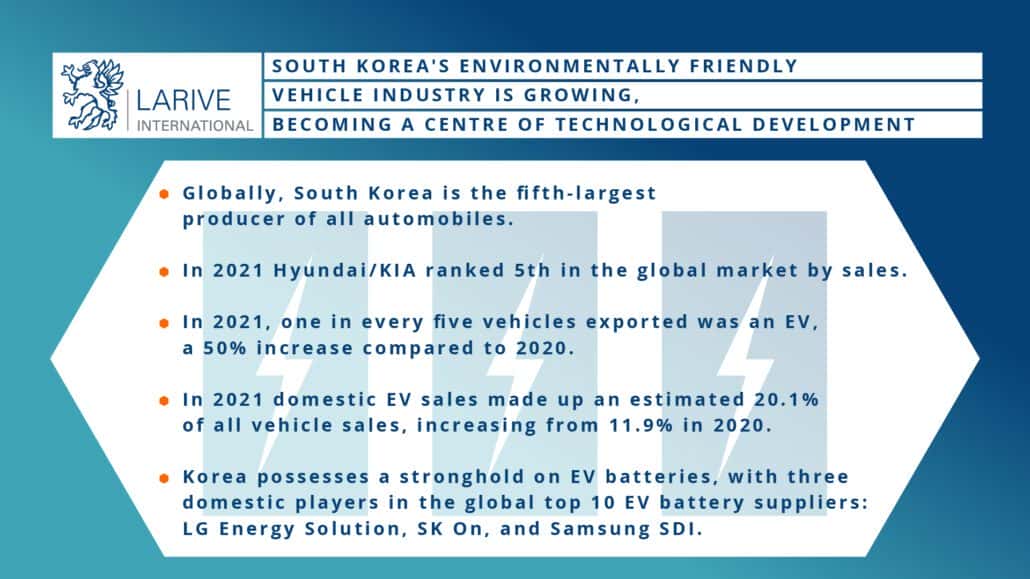 Keen to learn more about the automotive industry and EV developments in South Korea? This article was drafted with the input provided by IRC Consulting. Larive International and its South Korea-based Larive Group partner IRC Consulting are specialized in developing and implementing market entry and growth strategies. Reach out to one of our colleagues!